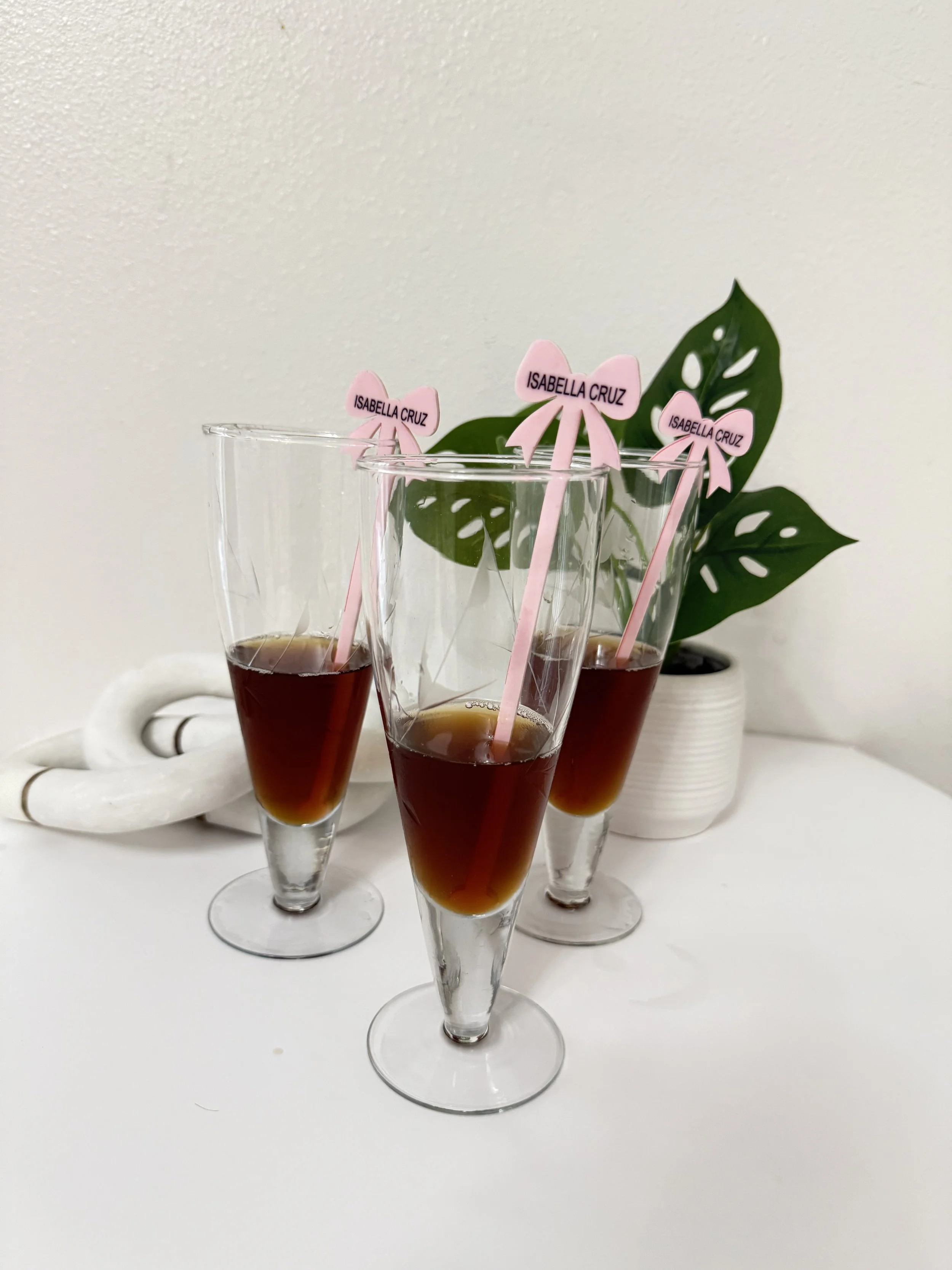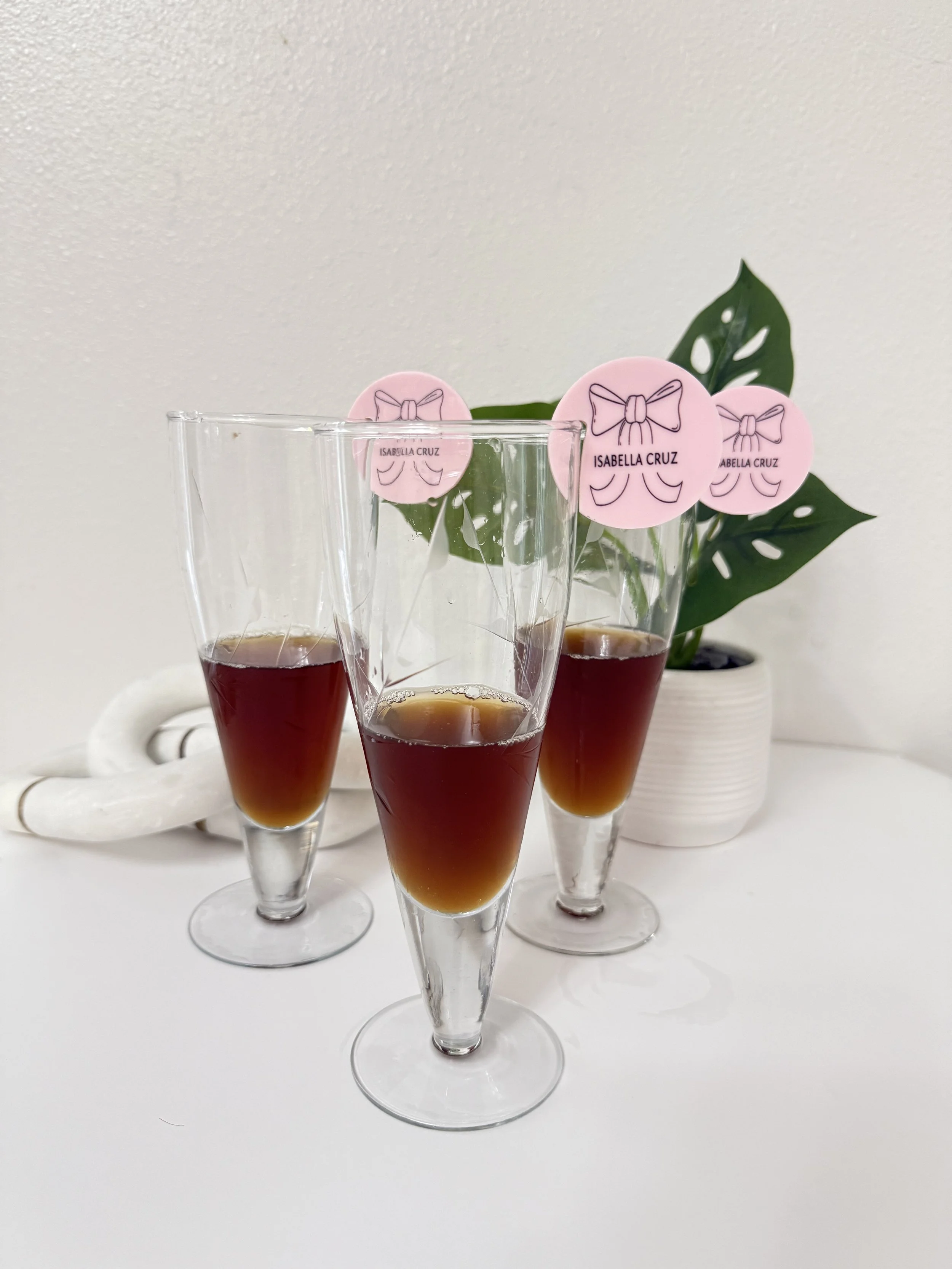 Drink Stirrers Personalized UV Printed $2.50 Custom Engraved Acrylic Stirrer $2.00 Initial & Number Drink Stirrers $1.50 Circle Drink Tag $1.60 Bow Name Drink Stirrers $2.40